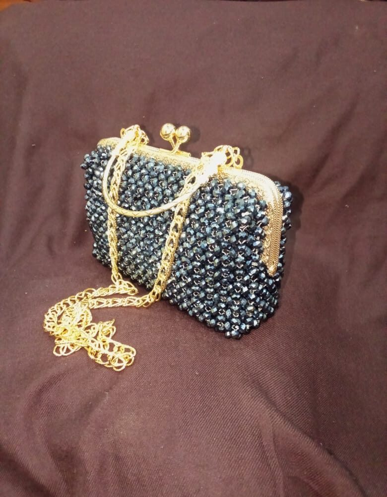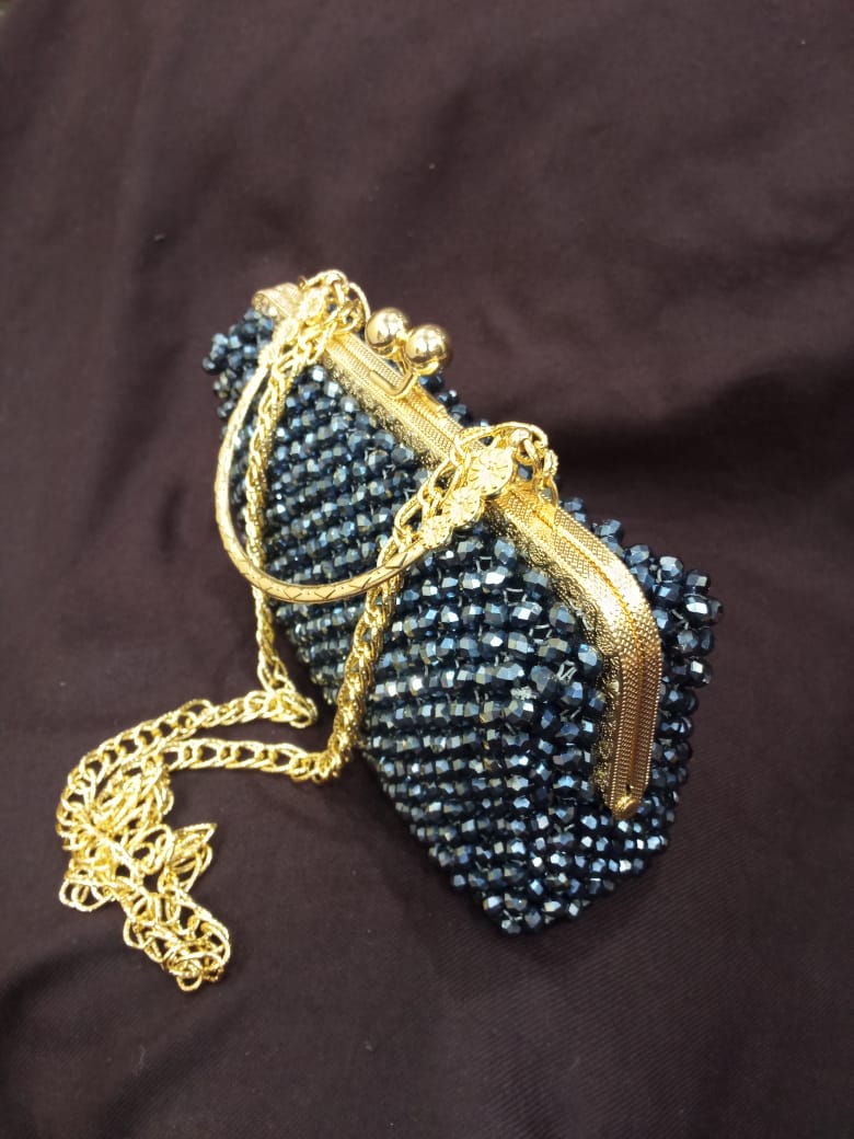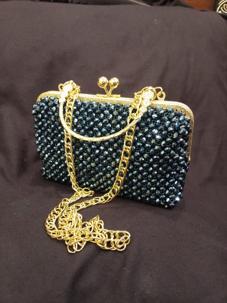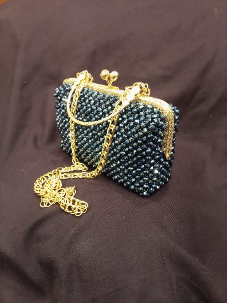 Handcrafted with shimmering pearls in an elegant Off-White tone, this bag beautifully blends tradition and luxury. Compact yet spacious, it’s a graceful statement for festive and formal occasions.